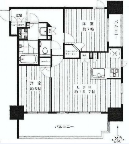 角部屋2面採光の2LDKタイプ。床暖房、ウォークインクローゼット付。